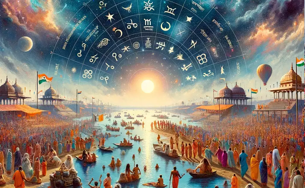 बृहस्पति (संस्कृत में गुरु के रूप में जाना जाता है), ज्ञान और आध्यात्मिक विकास से जुड़ा ग्रह, कुंभ राशि में प्रवेश करता है। यह त्यौहार के नाम का ज्योतिषीय मूल है, क्योंकि संस्कृत में "कुंभ" का अर्थ "घड़ा" या "कुंभ" होता है। सूर्य स्थान के आधार पर मेष (मेष) या मकर (मकर) में प्रवेश करता है। चंद्रमा एक विशेष चरण में संरेखित होता है, जो त्यौहार के आध्यात्मिक महत्व को बढ़ाता है।